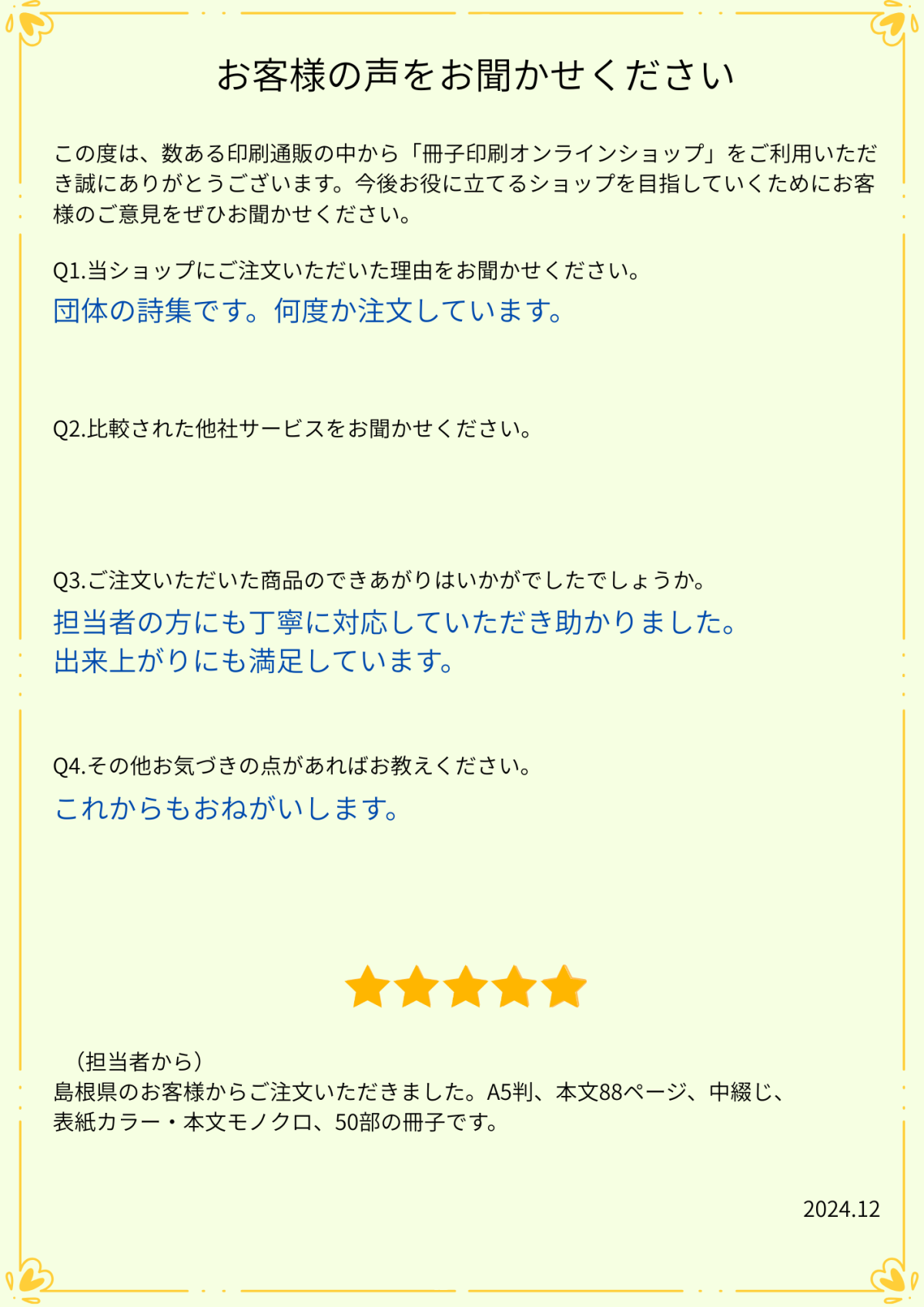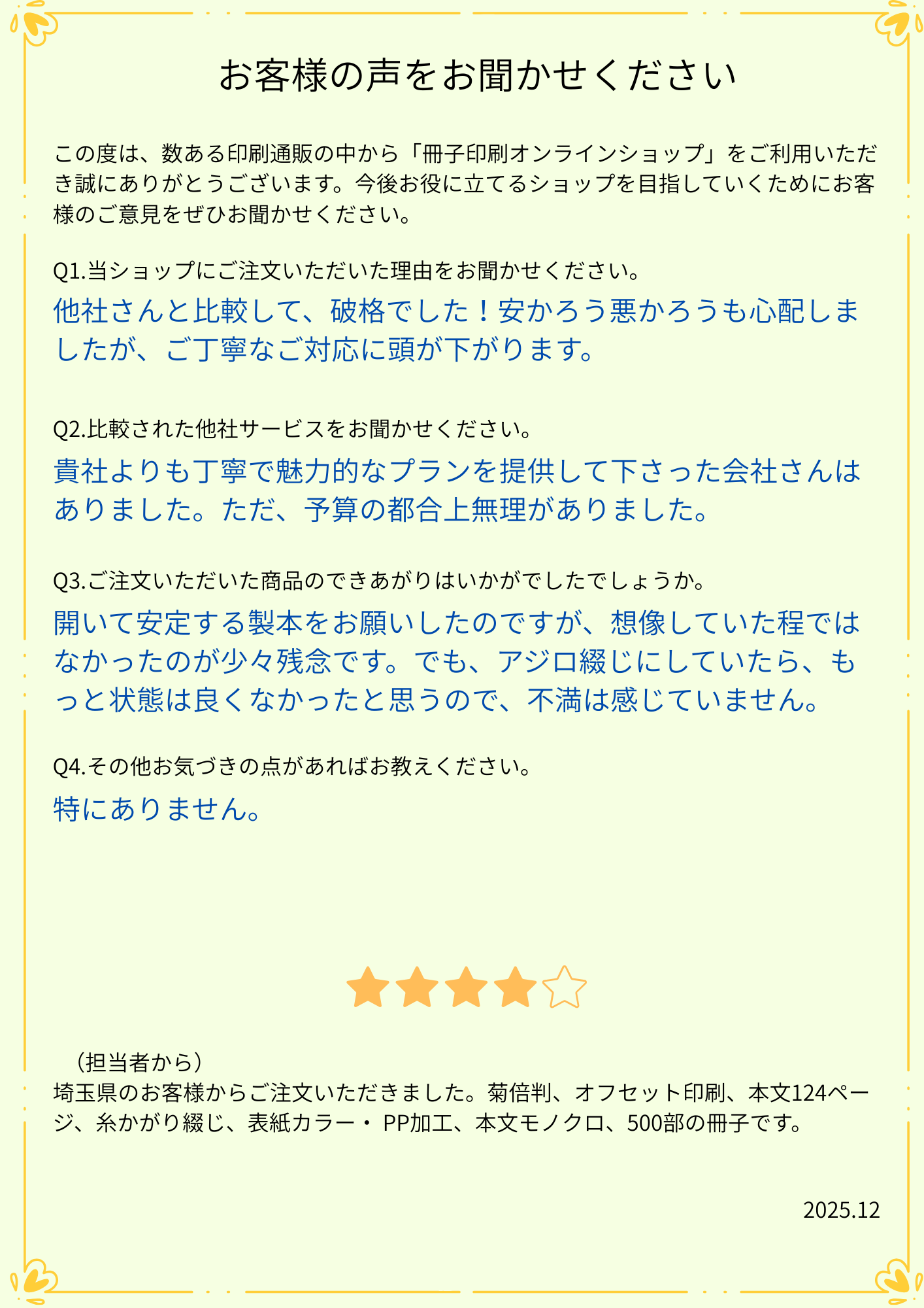アンケート「お客様の声」をいただきました。